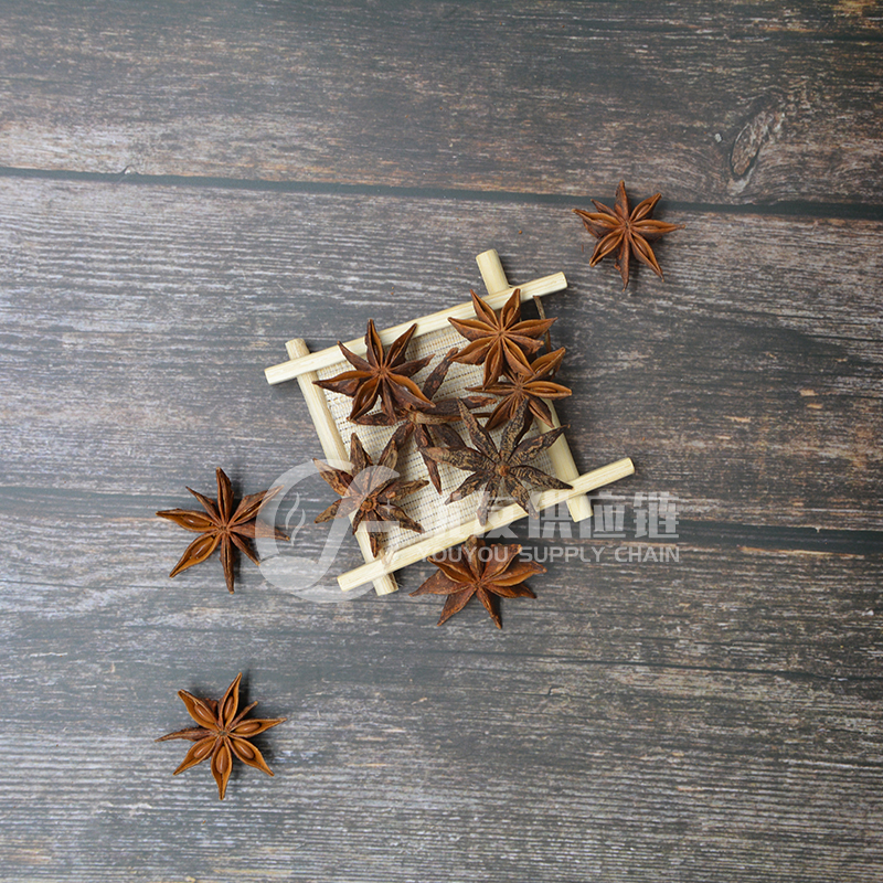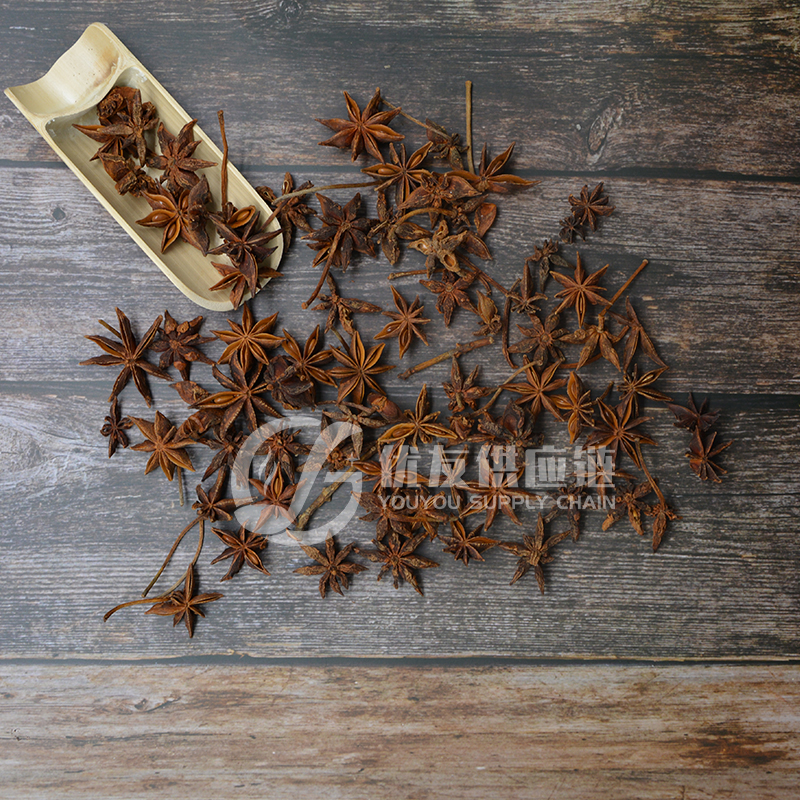 八角梗长20-56毫米,聚合果,直径3.5-4厘米,饱满平直,蓇葖多为8,呈八角形,长14-20毫米,宽7-12毫米,厚3-6毫米,先端钝或钝尖。种子长7-10毫米,宽4-6毫米,厚2.5-3毫米。八角为必备款的调味香料,味香甜。八角果实在日常调味中可直接使用,如炖、煮、腌、卤、泡等,也可直接加工成五香调味粉。